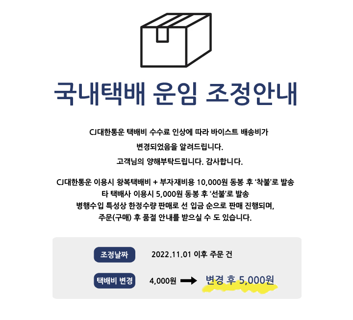 배송업체 : CJ대한통운 택배 무료 / 퀵배송 착불